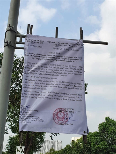 | Thông báo của UBND phường Phú Mỹ khuyến cáo việc giao dịch liên quan tới dự án Vinaland Tower |