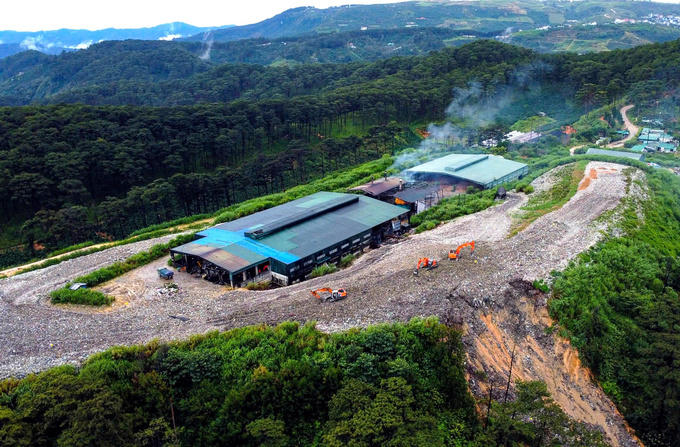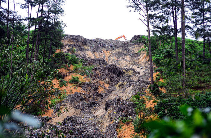 Hàng trăm tấn rác thải rắn từ nhà máy trên đồi ở Đà Lạt đổ ập xuống bên dưới vùi lấp nhiều gốc thông, vườn cà phê của người dân.