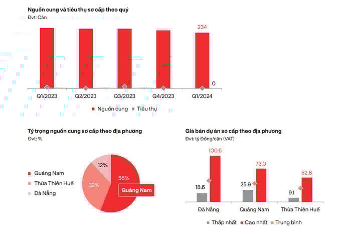 Báo cáo thị trường bất động sản Đà Nẵng và vùng phụ cận của Tập đoàn dịch vụ bất động sản DKRA (DKRA Group) cho biết, trong quý I/2024, phần lớn nguồn cung bất động sản nhà ở Đà Nẵng và vùng phụ cận đến từ hàng tồn kho của những dự án cũ, thị trường khan hiếm dự án mở bán mới. Sức cầu chung ở các phân khúc chủ lực mặc dù tăng nhưng vẫn còn ở mức khá thấp so với giai đoạn 2020 trở về trước.