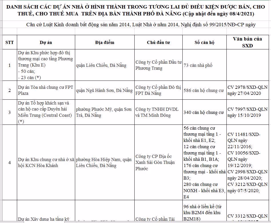 Sở Xây dựng TP Đà Nẵng vừa công bố danh sách 11 dự án nhà ở hình thành trong tương lai đủ điều kiện được bán, cho thuê, thuê mua trên địa bàn thành phố.