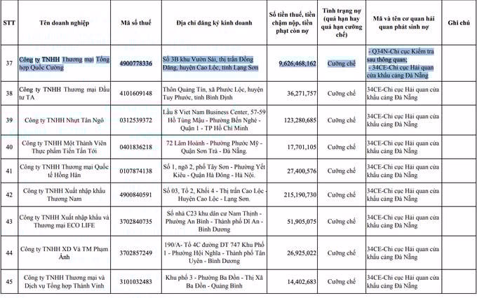 Doanh nghiệp có số tiền nợ thuế nhiều nhất được Cục Hải quan Tp.Đà Nẵng công khai lần này là Công ty TNHH Thương mại Tổng hợp Quốc Cường, có địa chỉ đăng ký kinh doanh tại số 3B khu Vườn Sái, thị trấn Đồng Đăng, huyện Cao Lộc, tỉnh Lạng Sơn, với số tiền nợ thuế hơn 9,6 tỷ đồng.