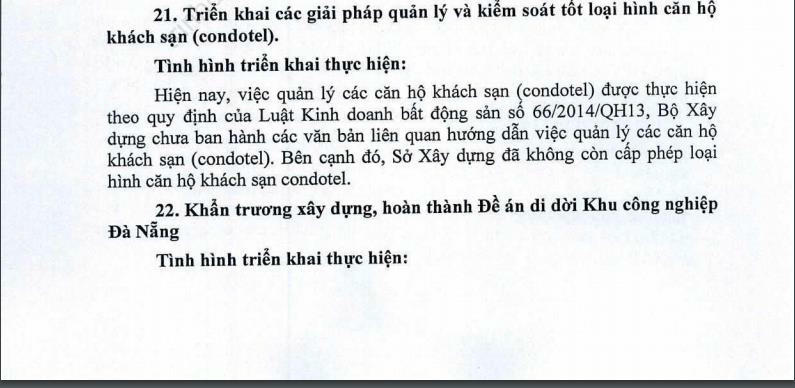 Theo đó, UBND TP Đà Nẵng cho biết, hiện nay, việc quản lý condotel được thực hiện theo quy định của Luật Kinh doanh bất động sản số 66/2014/QH13. Bộ Xây dựng chưa ban hành các văn bản liên quan hướng dẫn việc quản lý condotel. Bên cạnh đó, Sở Xây dựng TP Đà Nẵng đã không còn cấp phép loại hình căn hộ condotel.