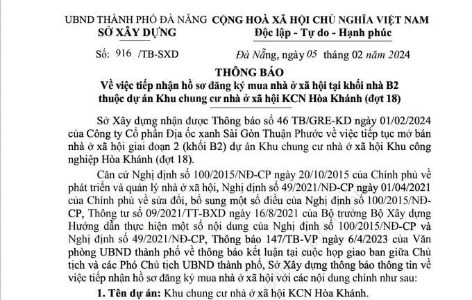Theo thông báo, đây là đợt thứ 18 Sở Xây dựng TP. Đà Nẵng rao bán nhà ở xã hội tại dự án khu chung cư nhà ở xã hội khu công nghiệp Hòa Khánh.