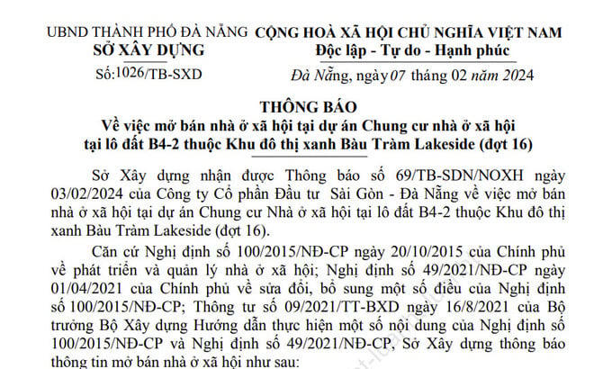 Văn bản thông báo của Sở Xây dựng TP. Đà Nẵng