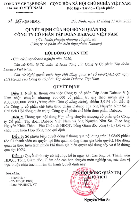 Dabaco Việt Nam dự kiến nhận chuyển nhượng 900.000 cổ phần của CTCP Chế biến thực phẩm Dabaco, trị giá theo mệnh giá 9 tỷ đồng từ ông Nguyễn Như So.