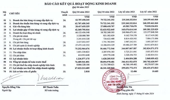 Cụ thể, theo báo cáo tài chính quý IV/2023 cho thấy, Nam Tân Uyên đã mang về 62,78 tỷ đồng, giảm so với cùng kỳ năm 2022 nhưng doanh thu từ hoạt động tài chính tăng cao tới 66,12 tỷ đồng trong khi cùng kỳ chỉ mang về 18,78 tỷ đồng, tăng gấp 3,5 lần so với cùng kỳ, kéo theo lợi nhuận thuần từ hoạt động kinh doanh tăng trưởng đạt kết quả 75,25 tỷ đồng. Ngoài ra, trong quý IV/2023, NTC còn có lợi nhuận khác hơn 1,23 tỷ đồng nên cả quý mang lại 76,48 tỷ đồng. Sau khi trừ đi các loại thuế phí, công ty mang về 67,62 tỷ đồng.