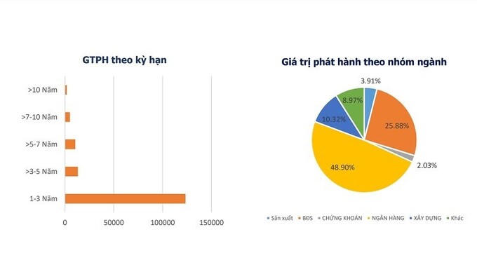 Nhóm Ngân hàng đang dẫn đầu về giá trị phát hành với tổng giá trị 80.466 tỷ đồng, tương đương 48,9% tổng giá trị phát hành. Kỳ hạn từ 1 đến 3 năm chiếm phần lớn giá trị phát hành trong nhóm này với 62.848 tỷ đồng, chiếm 78,1%.