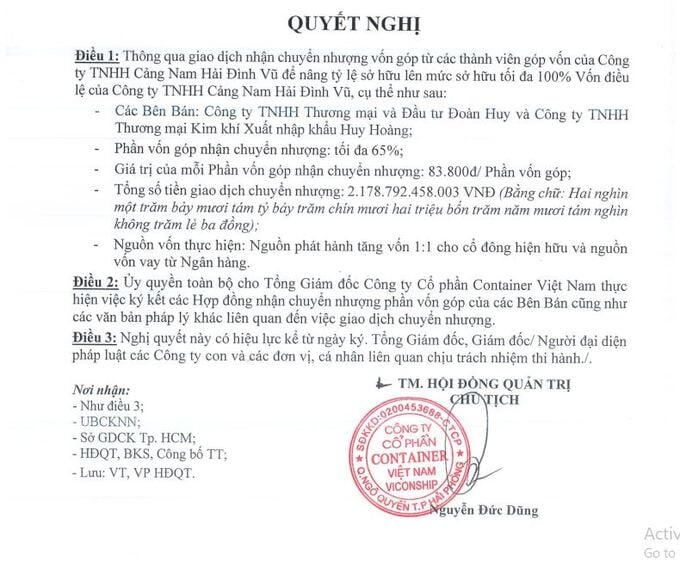 HĐQT cũng ra thêm nghị quyết thông qua phương án vay vốn với tổng hạn mức 1.450 tỷ đồng tại Ngân hàng TMCP Xuất nhập khẩu Việt Nam (Eximbank) - chi nhánh Hải Phòng để thực hiện giao dịch nhận chuyển nhượng Cảng Nam Hải Đình Vũ.