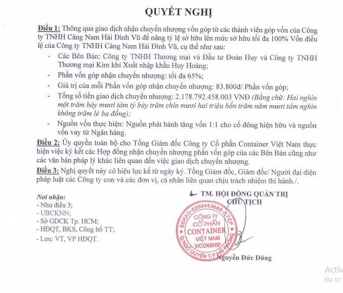 CTCP Tập đoàn Container Việt Nam (Viconship, mã chứng khoán: VSC) vừa công bố Nghị quyết chuyển nhượng vốn góp từ cổ đông của Công ty TNHH Cảng Nam Hải Đình Vũ để nâng tỷ lệ sở hữu lên tối đa 100%.