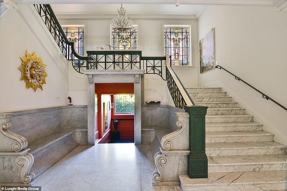 Chủ nhân giữ lại tiền sảnh ốp đá cẩm thạch, cửa sổ kính màu, đèn chùm như nguyên bản ban đầu.