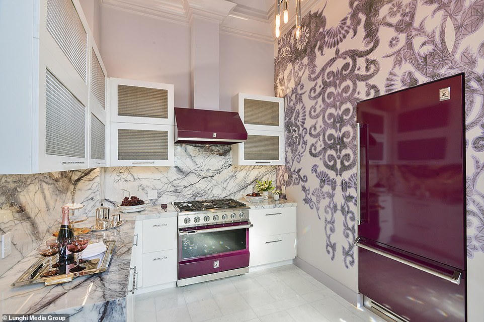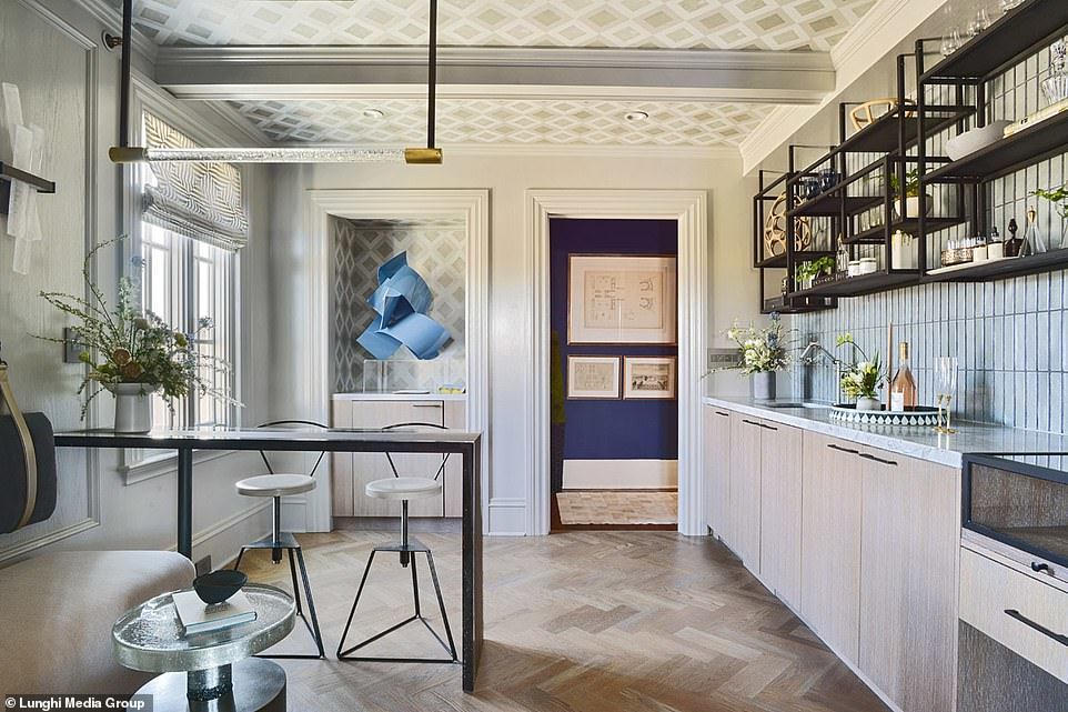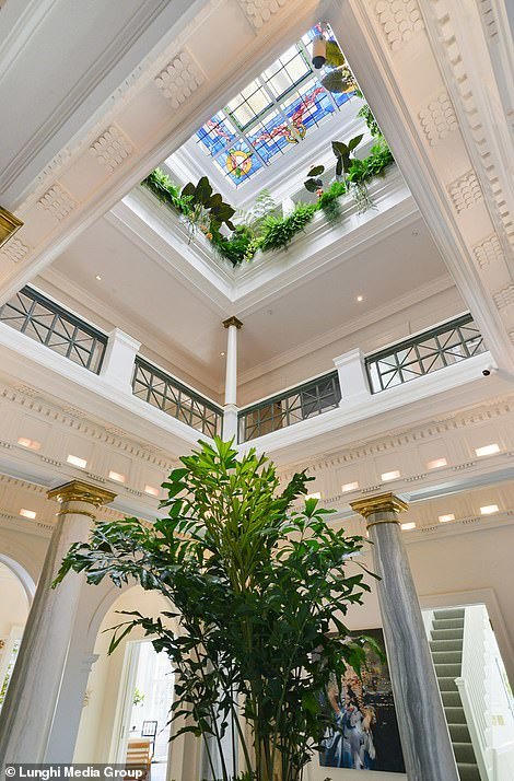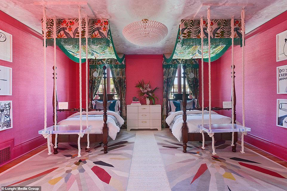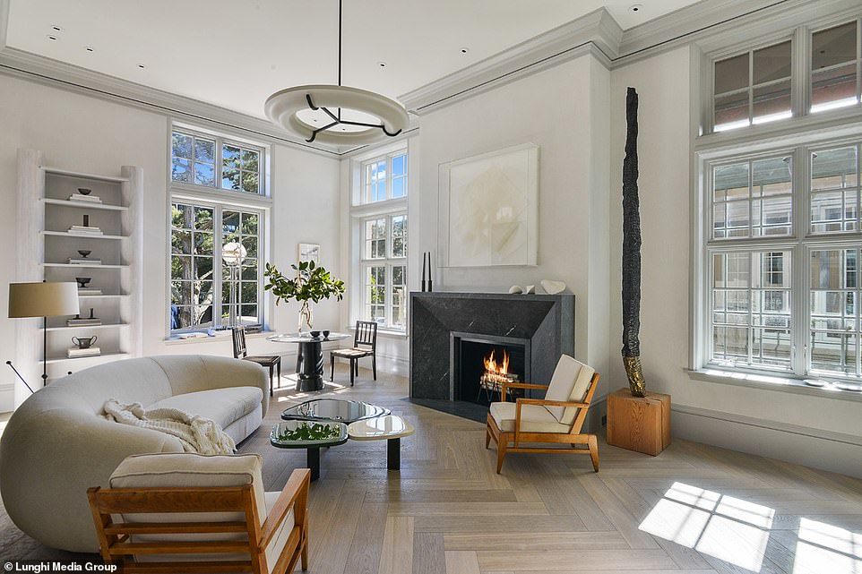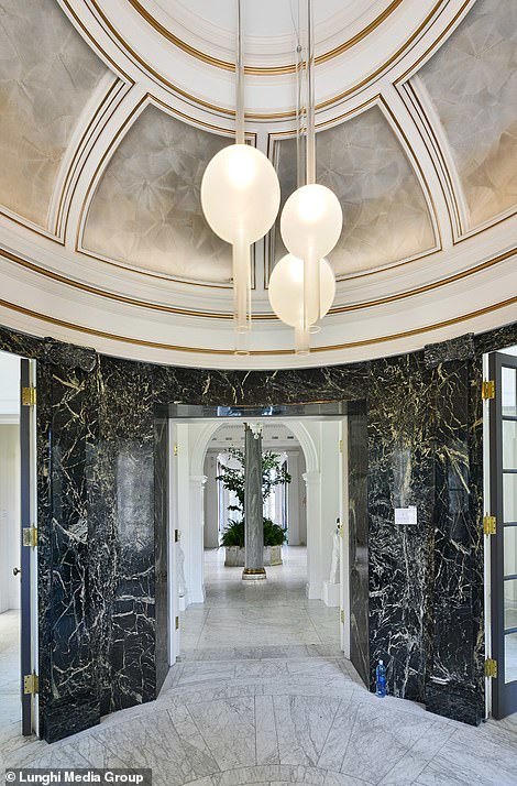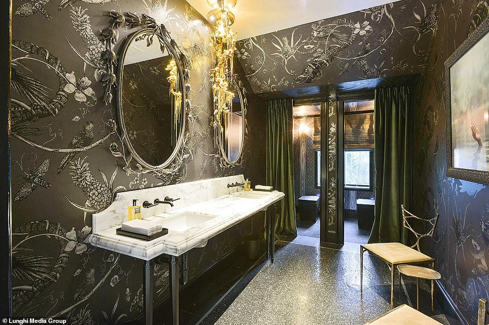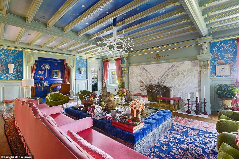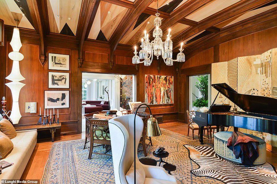 Một trong các phòng khách có ghế phủ lớp nhung màu hồng, có các gờ ở trần sơn màu vàng. Phòng khách khác có tường ốp gỗ, treo những tác phẩm nghệ thuật hiện đại lấy cảm hứng phong cách những năm 1950-1960. Biệt thự là sự pha trộn giữa cũ và mới