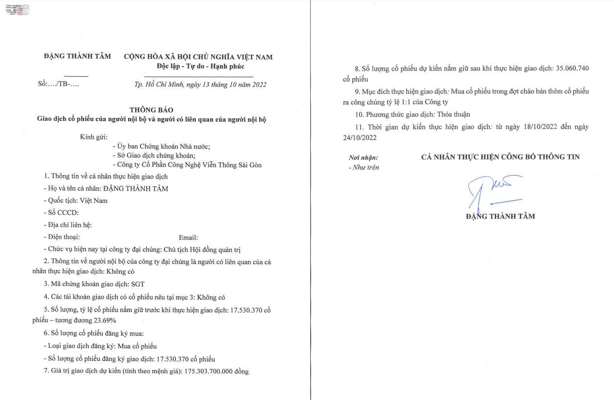 Cụ thể, ông Đặng Thành Tâm nắm hơn 17,5 triệu cổ phiếu SGT, tương đương tỷ lệ sở hữu 23,69% và sẽ phải chi 175 tỷ đồng cho thương vụ mua cổ phiếu này, dự kiến từ ngày 18-24/10. Cùng ông Tâm, các cổ đông khác góp tổng cộng thêm 740 tỷ đồng cho SGT.