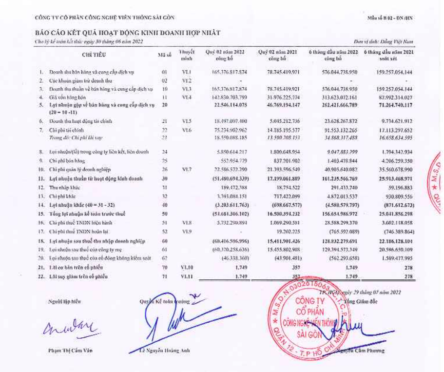 Trong quý II/2022, Saigontel ghi nhận doanh thu đạt 165,38 tỷ đồng, tăng 110% so với cùng kỳ và lợi nhuận sau thuế ghi nhận lỗ 60,42 tỷ đồng so với cùng kỳ lãi 15,41 tỷ đồng, tức tăng lỗ thêm 75,83 tỷ đồng. Trong đó, biên lợi nhuận gộp giảm mạnh từ 59,4% về chỉ còn 13,6%.