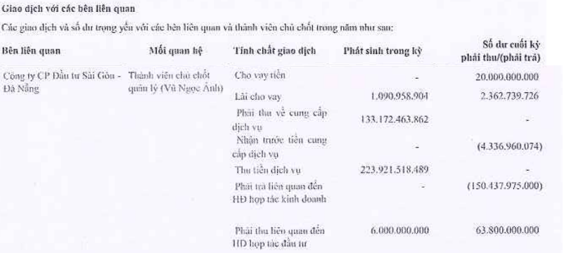 Ngoài ra, điểm đáng lưu ý trong BCTC 6 tháng đầu năm, Saigontel có nhiều giao dịch với CTCP Đầu tư Sài Gòn Đà Nẵng. Trong đó, 20 tỷ đồng cho vay tiền; 63,8 tỷ đồng phải thu liên quan đến hợp đồng hợp tác đầu tư; 2,36 tỷ đồng lãi cho vay…