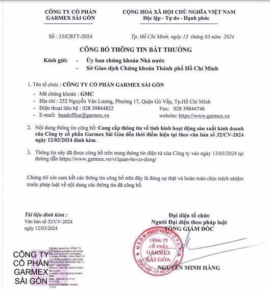 Ngày 13/3/2024, CTCP Garmex Sài Gòn (mã GMC) gửi Sở Giao dịch Chứng khoán TP. HCM (HoSE) công bố tình hình kinh doanh của công ty năm 2023.