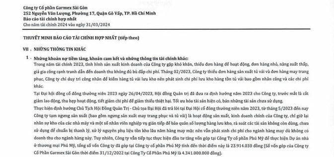 Theo nội dung tài liệu Đại hội đồng cổ đông thường niên năm 2024 sẽ diễn ra vào ngày 27/6 tới của Garmex Sài Gòn thì trong năm tài chính 2023, tình hình sản xuất kinh doanh của Garmex Sài Gòn gặp khó khăn, thiếu đơn hàng để hoạt động, đơn hàng nhỏ, năng suất thấp, giá gia công cạnh tranh dẫn đến doanh thu không đủ bù đắp chi phí.
