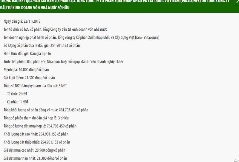 Theo Sở Giao dịch chứng khoán Hà Nội (HNX), Tổng công ty Đầu tư Kinh doanh vốn Nhà nước (SCIC) đã bán thoái vốn thành công 255 triệu cổ phiếu VCG tương đương 57,71% vốn điều lệ Tổng Công ty CP Xuất nhập khẩu và Xây dựng Việt Nam - Vinaconex.