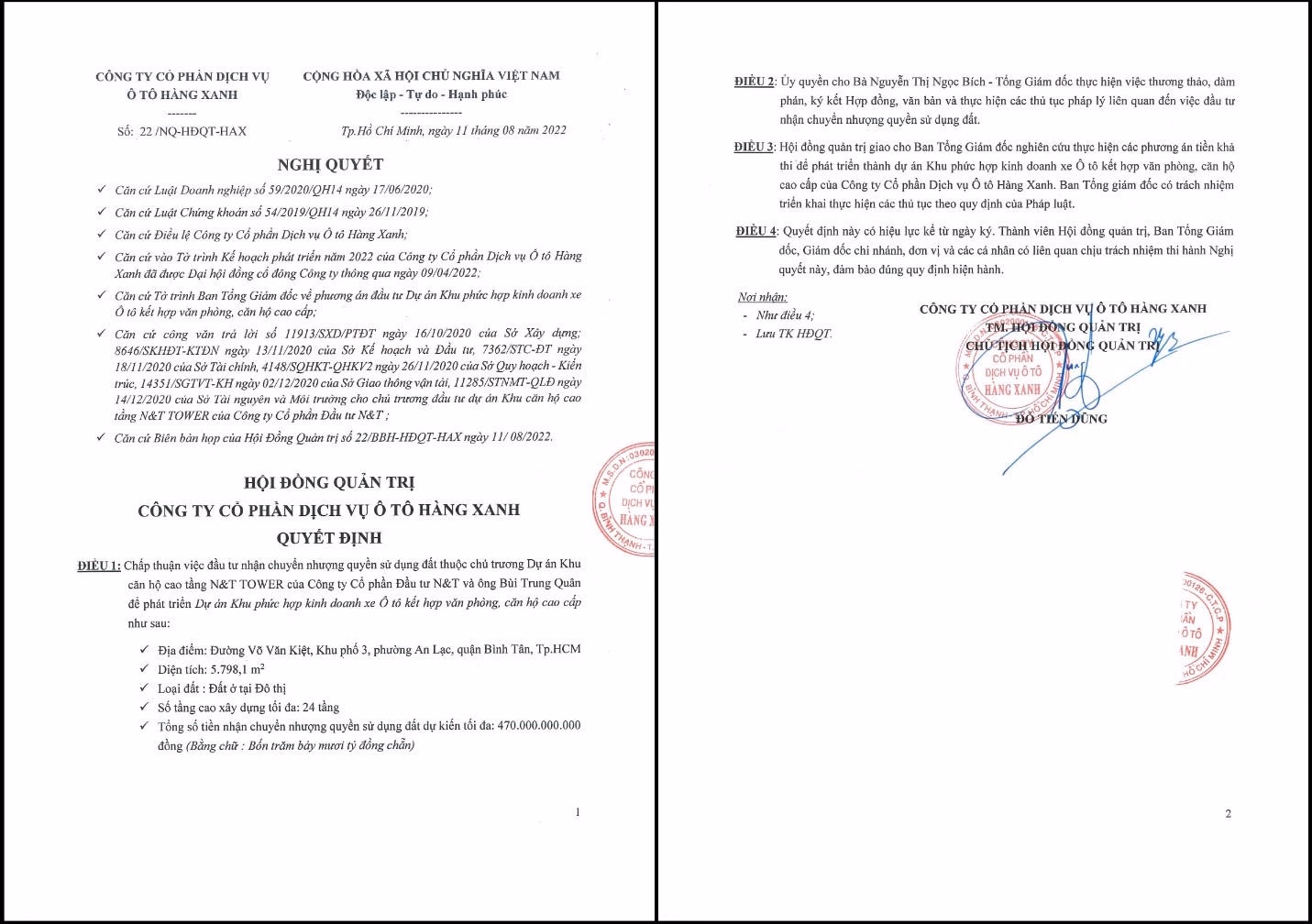 HĐQT CTCP Dịch vụ Ô tô Hàng Xanh (Haxaco, mã CK: HAX) vừa có Nghị quyết thông qua đầu tư nhận chuyển nhượng quyền sử dụng đất thuộc dự án Khu căn hộ cao tầng N&T Tower của CTCP Đầu tư N&T và ông Bùi Trung Quân.