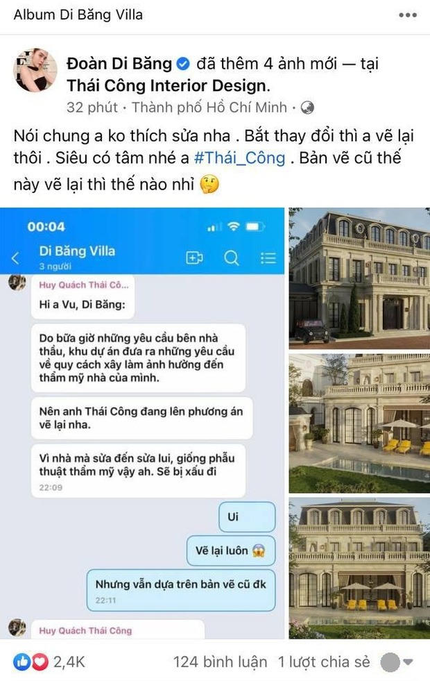 Tuy nhiên, thời điểm đó dịch bệnh bùng phát khiến công trình phải tạm dừng thi công. Đến đầu tháng 11/2021, Đoàn Di Băng thông báo về việc thay đổi toàn bộ thiết kế theo đề xuất của Thái Công. Nhà thiết kế này cho biết, do một số vấn đề từ phía thi công đã ảnh hưởng đến thiết kế ban đầu, nên thay vì sửa chữa, anh quyết định lên phương án thiết kế lại toàn bộ căn nhà.