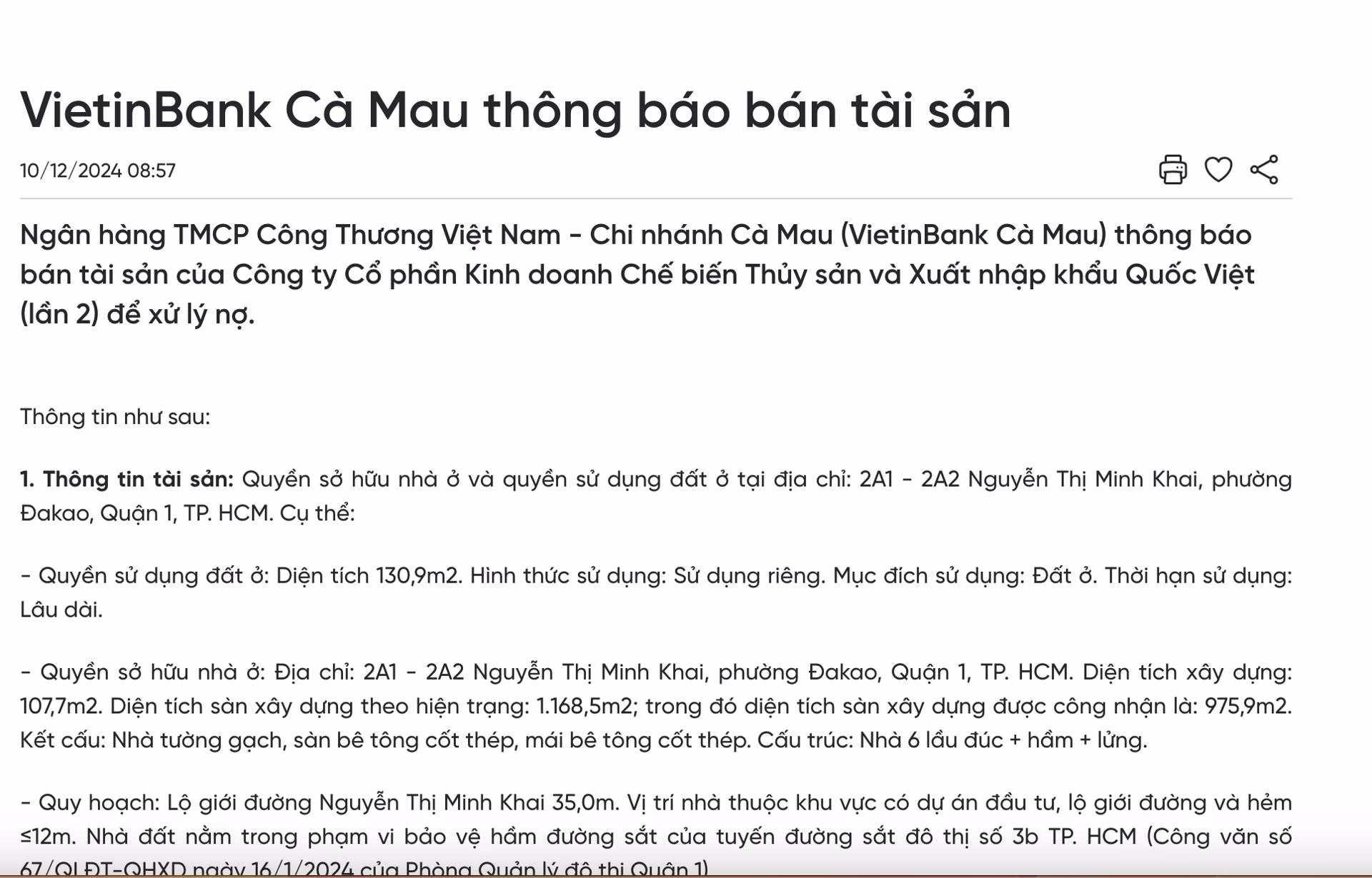 VietinBank Cà Mau thông báo bán tài sản của Công ty cổ phần Kinh doanh chế biến thủy sản và xuất nhập khẩu Quốc Việt để xử lý nợ. Giá khởi điểm giảm 4,1 tỷ đồng so với giá rao lần 1.