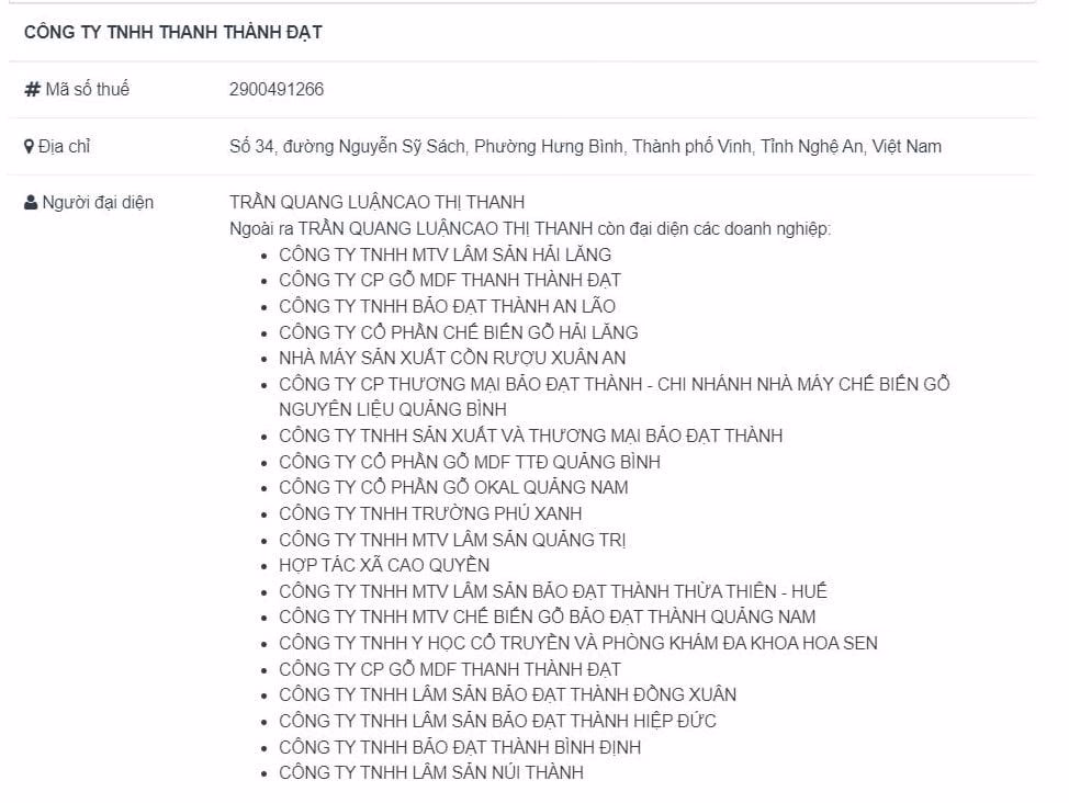 Ngoài Công ty TNHH Thanh Thành Đạt là cốt lõi, ông Trần Quang Luận còn đứng tên tại loạt doanh nghiệp khác là Công ty TNHH Nguyên liệu Giấy Nghệ An, Công ty TNHH Thương mại và dịch vụ vận tải Lam Hồng, Hợp tác xã Tùng Quân, CTCP Xây dựng Hạ tầng Thanh Thành Đạt, Công ty CP Plywood Thanh Thành Đạt, Công ty TNHH MTV Keo Công nghiệp Thanh Thành Đạt, Công ty CP Cơ khí và Thương mại Thanh Thành Đạt, Nhà máy Rượu Nghệ An, Nhà máy Chế biến gỗ xuất khẩu và trồng rừng Quỳnh Thiện và các chi nhánh thuộc Công ty TNHH Thanh Thành Đạt gồm: Chi nhánh SX, TM và làng nghề Thành Đạt; Nhà máy chế biến gỗ xuất khẩu Ninh Phúc; Nhà máy gạch Tuynenl Nghi Xuân.