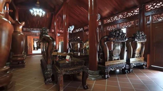 Bên trong căn nhà, không gian phòng khách gây ấn tượng với bộ bàn ghế đồ sộ làm từ gỗ cẩm Việt - một loại gỗ có giá trị cao, hương thơm đặc trưng và đường vân tinh tế. Bộ tràng kỷ được chế tác từ gỗ nguyên khối, riêng phần vai ghế có đường kính khoảng 1m. Ngoài ra, không gian này còn được trang trí với những tấm phù điêu bằng gỗ và đá cao khoảng 2,5m. Các tác phẩm điêu khắc gỗ bao gồm tranh khắc kim, tượng Phúc - Lộc - Thọ làm bằng gỗ hương, cùng một cầu đá nguyên khối nối giữa gian chính và gian phụ, phía dưới có hồ nuôi cá rồng và cá koi.