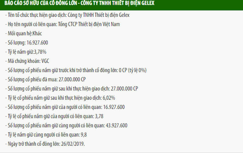 Trong khi đó, Gelex đang nắm giữ hơn 16,9 triệu cổ phần VGC (tương đương 3,78%).