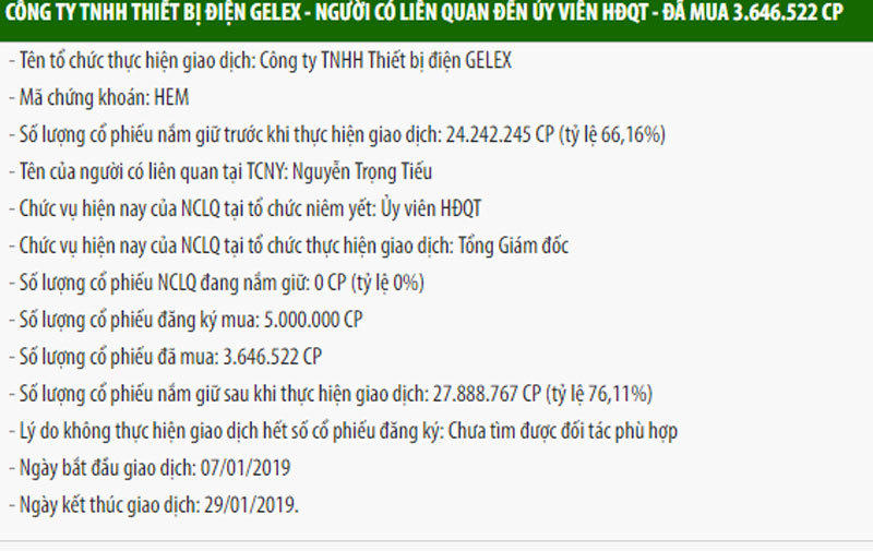 Thiết bị điện Gelex mua cổ phiếu Viglacera.