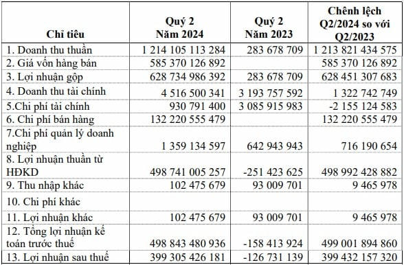 Với màn bứt tốc trong quý II vừa qua, lũy kế 6 tháng đầu năm, doanh thu thuần của BTH đạt 1214,13 tỷ đồng, tăng vọt từ mức 407,5 triệu đồng của 6 tháng đầu năm 2023. Lợi nhuận sau thuế của BTH trong 6 tháng đầu năm 2024 đạt 399,3 tỷ đồng trong khi cùng kỳ năm 2023, công ty này lỗ 126 triệu đồng.