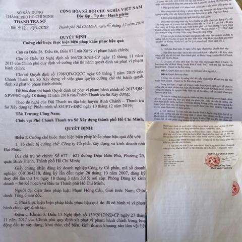 "Phần công trình xây dựng vi phạm trật tự xây dựng do xây dựng công trình không có giấy phép xây dựng mà theo quy định phải có giấy phép xây dựng. Buộc tháo dỡ công trình xây dựng không có giấy phép..." - văn bản của Thanh tra Sở Xây dựng TP. HCM nêu rõ.