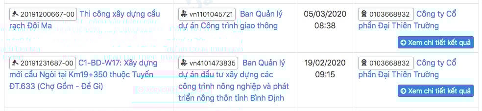 Theo dữ liệu của VietnamFinance, CTCP Đại Thiên Trường đã tham gia đấu và trúng thầu ít nhất 24 gói thầu, với tổng giá trị trúng thầu hơn 8.265,65 tỷ đồng. Trong đó, tổng giá trị trúng thầu với vai trò độc lập hơn 523,8 tỷ đồng và tổng giá trị trúng thầu với vai trò liên danh: 7.741,8 tỷ đồng.
