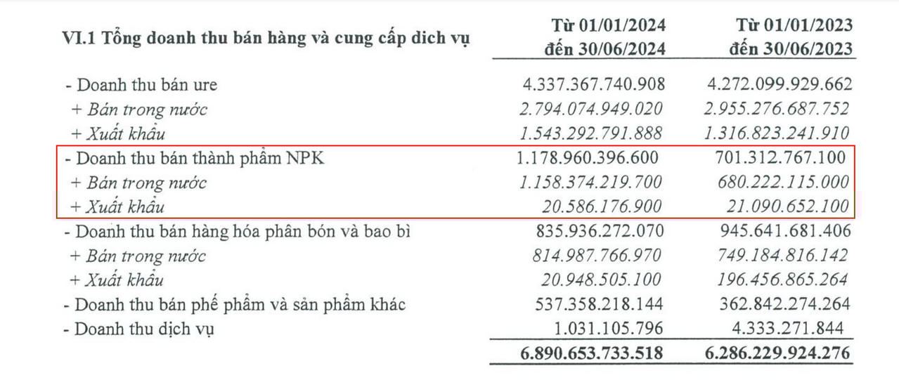 Đáng chú ý, nhìn vào cơ cấu doanh thu nửa đầu năm, mặc dù chỉ xếp thứ hai song thành phẩm NPK đang là mảng tăng trưởng mạnh nhất của Đạm Cà Mau với mức tăng 68%, vượt trội. so với mức tăng 1,5% của mảng chủ lực là ure.
