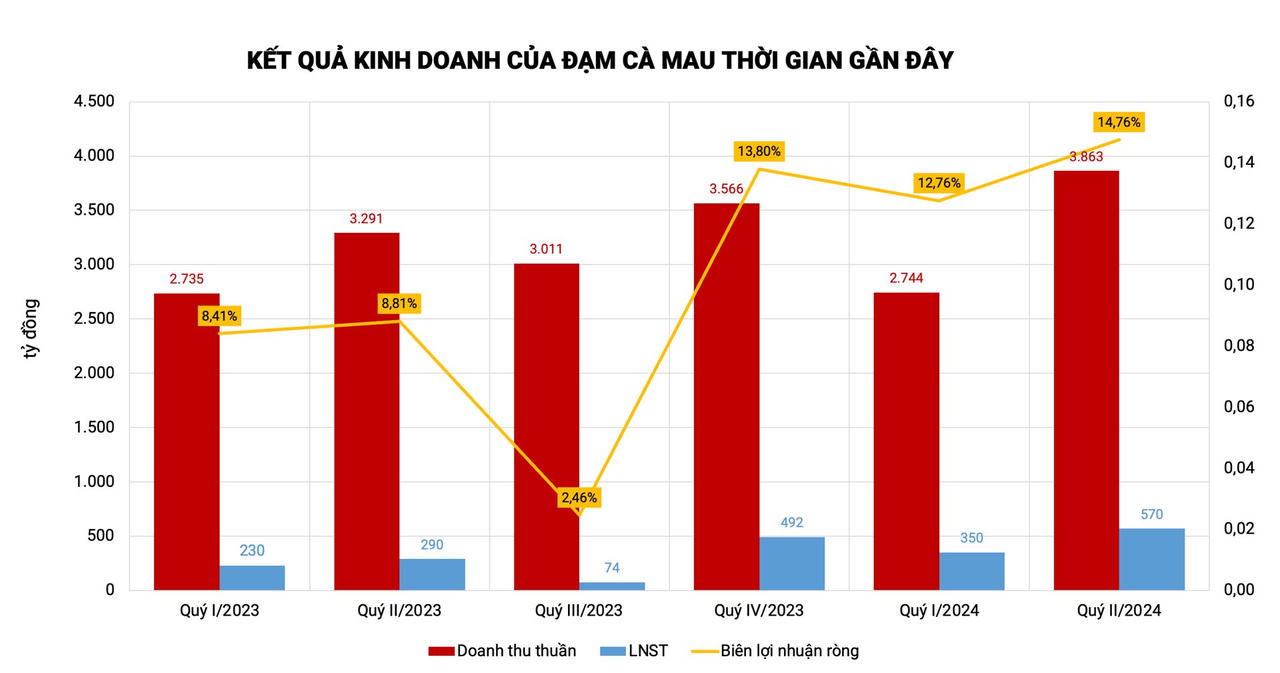 Lũy kế 6 tháng đầu năm 2024, Đạm Cà Mau ghi nhận doanh thu thuần đạt 6.607 tỷ đồng, tăng 10% so với cùng kỳ. Lợi nhuận sau thuế đạt 915 tỷ đồng, tăng 69% so với cùng kỳ năm 2023.
