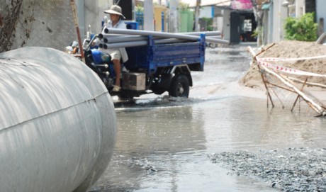 TNNĐ-Hơn 4 tháng nay, hàng nghìn hộ dân sống trên đường 49, P. Hiệp Bình Chánh (Q.Thủ Đức) phải chật vật sống cùng nước ngập cả tháng không rút.