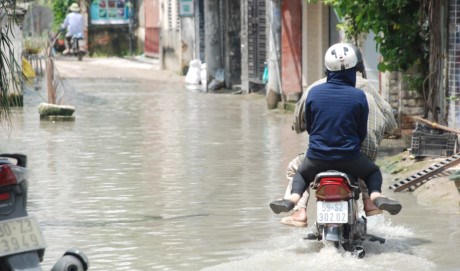 Một số đoạn nước ngập hơn nửa bánh xe máy.