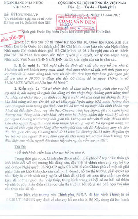 Ông Thanh cũng thông tin thêm, ngày 13/11/2015, Ngân hàng Nhà nước đã có văn bản trả lời kiến nghị của cử tri trước Kỳ họp thứ 10, Quốc hội khóa XIII, về việc xem xét hỗ trợ khách hàng đã ký hợp đồng tín dụng trước ngày 1/6/2016.