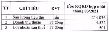 Vừa qua, CTCP Tập đoàn Hoa Sen (HOSE: HSG) vừa công bố ước tính kết quả kinh doanh hợp nhất tháng 03/2021. Theo đó, sản lượng tiêu thụ tháng 3 ước đạt 214.036 tấn, doanh thu thuần ước đạt 4.522 tỷ đồng, lợi nhuận sau thuế ước đạt 501 tỷ đồng.