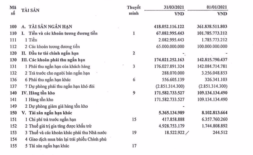 Tương tự như VCA, tính đến 31/3/2021, tiền và các khoản tương tiền tại TDS giảm 34% so với đầu năm, xuống còn 67 tỷ đồng; trong khi các khoản phải thu ngắn hạn tăng 22% lên mức 174 tỷ đồng; hàng tồn kho tại TDS tăng 57% lên mức 171,5 tỷ đồng; nợ phải trả cũng tăng 32% lên mức 165 tỷ đồng trong đó nợ ngắn hạn tăng vọt 54% lên mức 114 tỷ đồng.