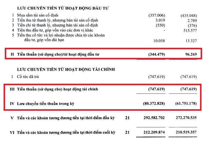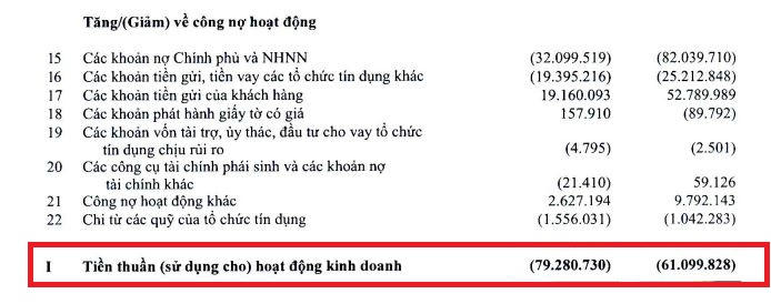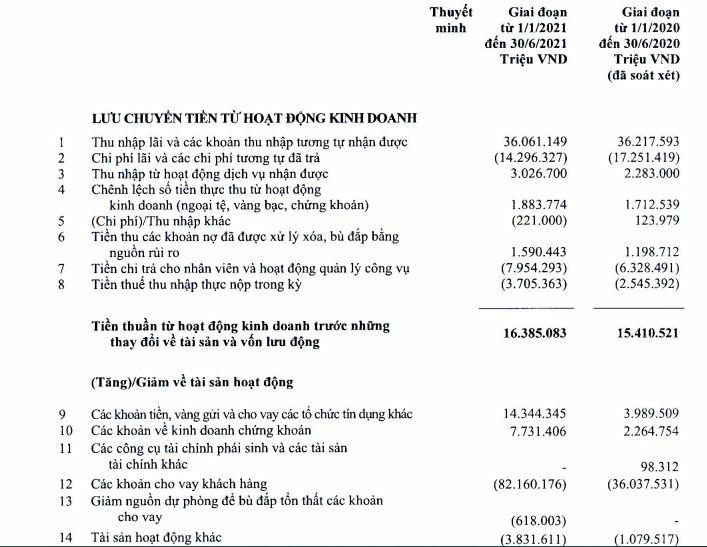 Cụ thể, 6 tháng đầu năm 2021, dòng tiền hoạt động kinh doanh tại Vietcombank âm gần 79.281 tỷ đồng trong khi cùng kỳ 2020 âm 61.099 tỷ đồng. Dòng tiền từ hoạt động đầu tư cũng âm hơn 344 tỷ đồng trong khi cùng kỳ dương 96 tỷ đồng. Dòng tiền hoạt động tài chính âm hơn 747,6 tỷ đồng. Do đó, tổng lưu chuyển tiền thuần trong kỳ âm gần 80.373 tỷ đồng (cùng kỳ 2020 chỉ âm 61.751 tỷ đồng).