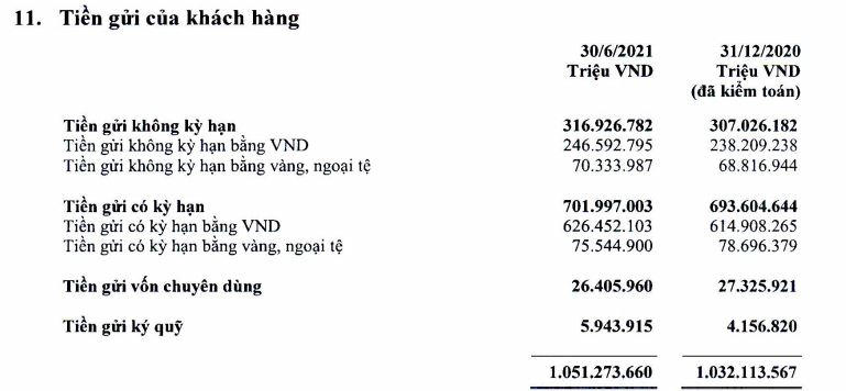 Về nguồn vốn kinh doanh, số dư tiền gửi khách hàng tại Vietcombank tăng nhẹ 1,9% đạt hơn 1,05 triệu tỷ đồng. Ngoài ra, tiền vay TCTD khác tăng 32% (3,517 tỷ đồng). Tuy nhiên, tiền gửi của các TCTD khác giảm 20% ghi nhận 80.671 tỷ đồng so với đầu năm.