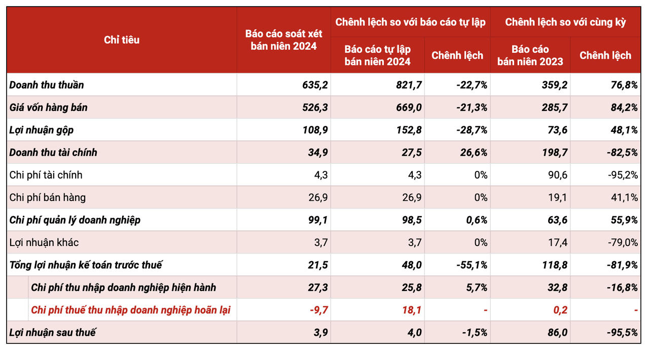 Cụ thể, sau soát xét, lợi nhuận thuần từ hoạt động kinh doanh đạt chưa đầy 18 tỷ đồng, giảm 2,4 lần so với con số 44 tỷ trên báo cáo tự lập của doanh nghiệp. Lợi nhuận trước thuế tương ứng cũng “bay mất” quá nửa, chỉ đạt vỏn vẹn 21,5 tỷ đồng. Trong khi đó, chi phí thuế thu nhập doanh nghiệp hiện hành tăng từ gần 26 tỷ đồng lên hơn 27 tỷ đồng, cao hơn lợi nhuận.