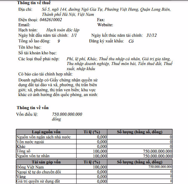 Doanh nghiệp này được thành lập vào ngày 5/5/2021, đặt trụ sở tại tầng 4 toà nhà Việt Anh, phố Hoa Lâm, phường Việt Hưng, quận Long Biên, Hà Nội. Tổng số lao động theo đăng ký thuế là 10 người.