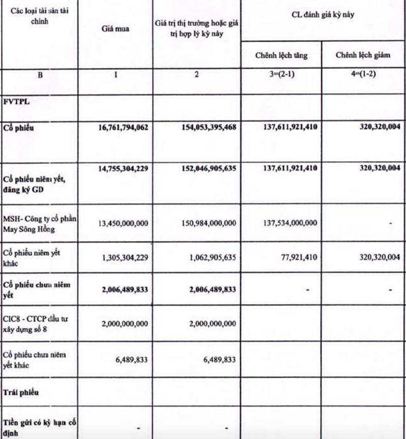 Kỳ này việc thực hiện đánh giá lại cổ phiếu MSH của May Sông Hồng (MSH) lại dẫn đến lãi tài sản tài chính ghi nhận thông qua lãi/lỗ (FVTPL) âm 144,6 tỷ đồng.