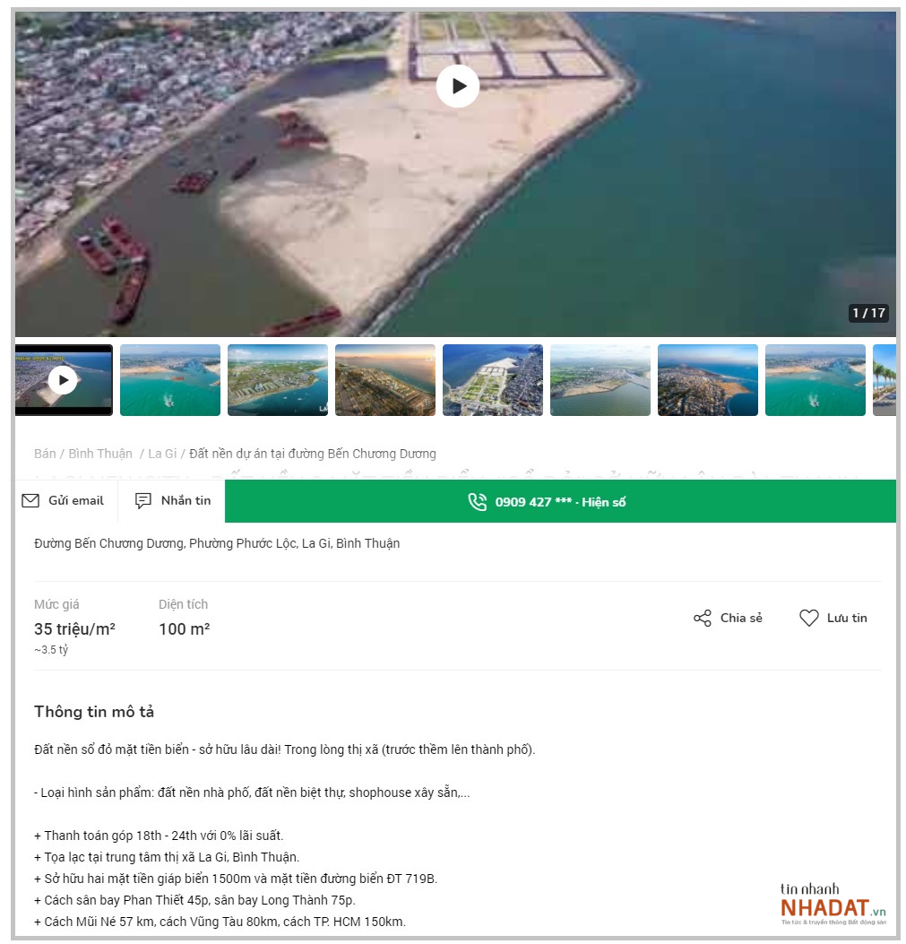 Một mảnh khác tại đường Bến Chương Dương, phường Phước Lộc, thị xã La Gi có diện tích 100m2 cũng được đăng bán với giá 35 triệu đồng/m2.