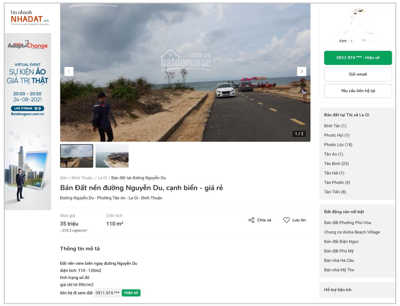Lấy ví dụ như một mảnh đất có diện tích 110m2 tại đường Nguyễn Du, thị xã La Gi, tỉnh Bình Thuận được rao bán trên trang batdongsan.com.vn với giá 35 triệu đồng/m2.