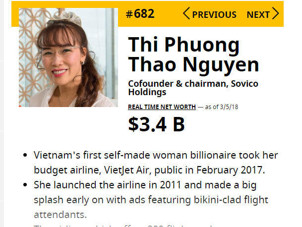 Theo bảng xếp hạng năm ngoái, Việt Nam có 2 tỷ phú USD là ông Phạm Nhật Vượng và bà Nguyễn Thị Phương Thảo.