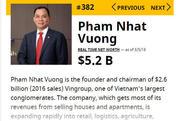Tại Việt Nam, bên cạnh 2 tỷ phú USD đã được xếp hạng từ các năm trước: ông Phạm Nhật Vượng (chủ tịch Vingroup) và bà Nguyễn Thị Phương Thảo (CEO VietJet) thì năm nay hứa hẹn có ít nhất 1 cái tên mới nữa.
