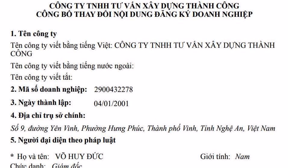 Công ty TNHH Tư vấn xây dựng Thành Công đăng ký nghành nghề hoạt động chính là bán buôn vật liệu, thiết bị lắp đặt khác trong xây dựng. Trong nhiều năm hoạt động, dưới sự chèo lái của doanh nhân sinh năm 1964 – Võ Huy Đức, trú tại phường Trường Thi, TP. Vinh, Xây dựng Thành Công được xem là một trong những nhà thầu khá may mắn khi trúng loạt dự án đầu tư xây dựng trên địa bàn tỉnh Nghệ An.