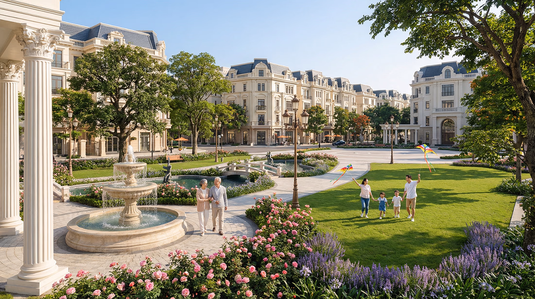 Ngôn ngữ kiến trúc Tân cổ điển tại đây được thể hiện tỉ mỉ qua từng đường nét phào chỉ, hệ cột trụ vững chãi và những mái vòm đặc trưng gợi nhắc về sự quý phái của những công trình kiến trúc vượt thời gian. Sự kết hợp khéo léo giữa nét cổ điển sang trọng hòa quyện cùng hơi thở đương đại giúp mỗi căn nhà không chỉ là tài sản có giá trị gia tăng bền vững mà còn là niềm kiêu hãnh cho mỗi chủ nhân.