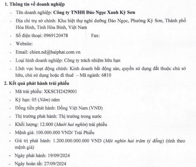 Thông tin trên Sở Giao dịch Chứng khoán Hà Nội (HNX), Công ty TNHH Đảo Ngọc Xanh Kỳ Sơn vừa công bố phát hành thành công lô trái phiếu XKSCH2429001 với tổng giá trị 1.200 tỷ đồng, lãi suất 12,5%/năm và kỳ hạn 5 năm, đáo hạn vào ngày 19/9/2029.